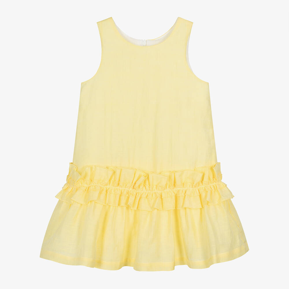 Lovely bright yellow dress for girls by Balloon Chic, with eye-catching ruffles around the skirt. Made in a lightweight linen blend with a soft sheen, it is ideal for both smart and casual days. It has a cotton voile lining for comfort, and fastens with a discreet, concealed zip on the back.