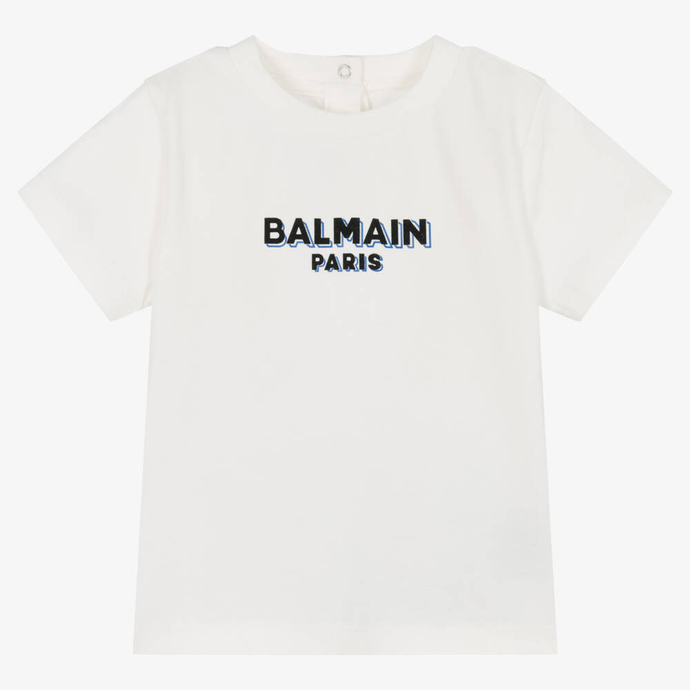 Ivory T-shirt for baby boys from luxury designer Balmain, made in soft cotton jersey. Cool and comfortable to wear, it has the Balmain Paris logo printed on the front in a sleek, black textured print, outlined in blue giving a three-dimensional effect. This crew neck top has short sleeves and white branded popper fastenings on the back for quick and easy dressing.