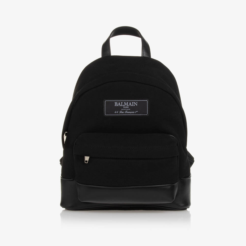 A black backpack for boys and girls by luxury brand Balmain, great for school and stylish as a casual accessory. Made from durable cotton canvas with a twill lining, the spacious main compartment has a useful internal pocket and a handy pouch pocket on the front, all fastening with practical zips. Trimmed with leather details and stitched with a Balmain Paris logo patch, it has a top handle for hanging on a hook and lightly padded adjustable straps for comfortable wear.