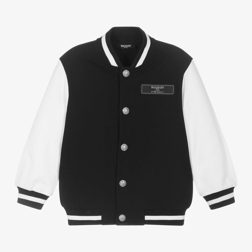 In a cool, monochrome design this bomber jacket for boys is by luxury French fashion house Balmain. Made in mid-weight cotton jersey, it has black and white striped ribbed trims and useful pockets concealed in the side seams. It fastens with silver embossed poppers and to complete the stylish designer look, a black logo label is stitched on the chest.