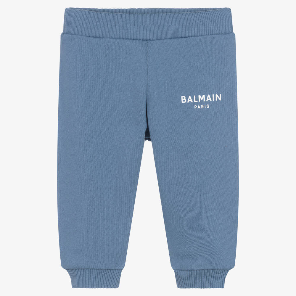 Blue joggers for little boys by luxury French brand Balmain, made in soft mid-weight cotton jersey. These comfortable joggers have stretchy ribbed cuffs and waistband and for a designer finish, the brand's logo is on the front in white.