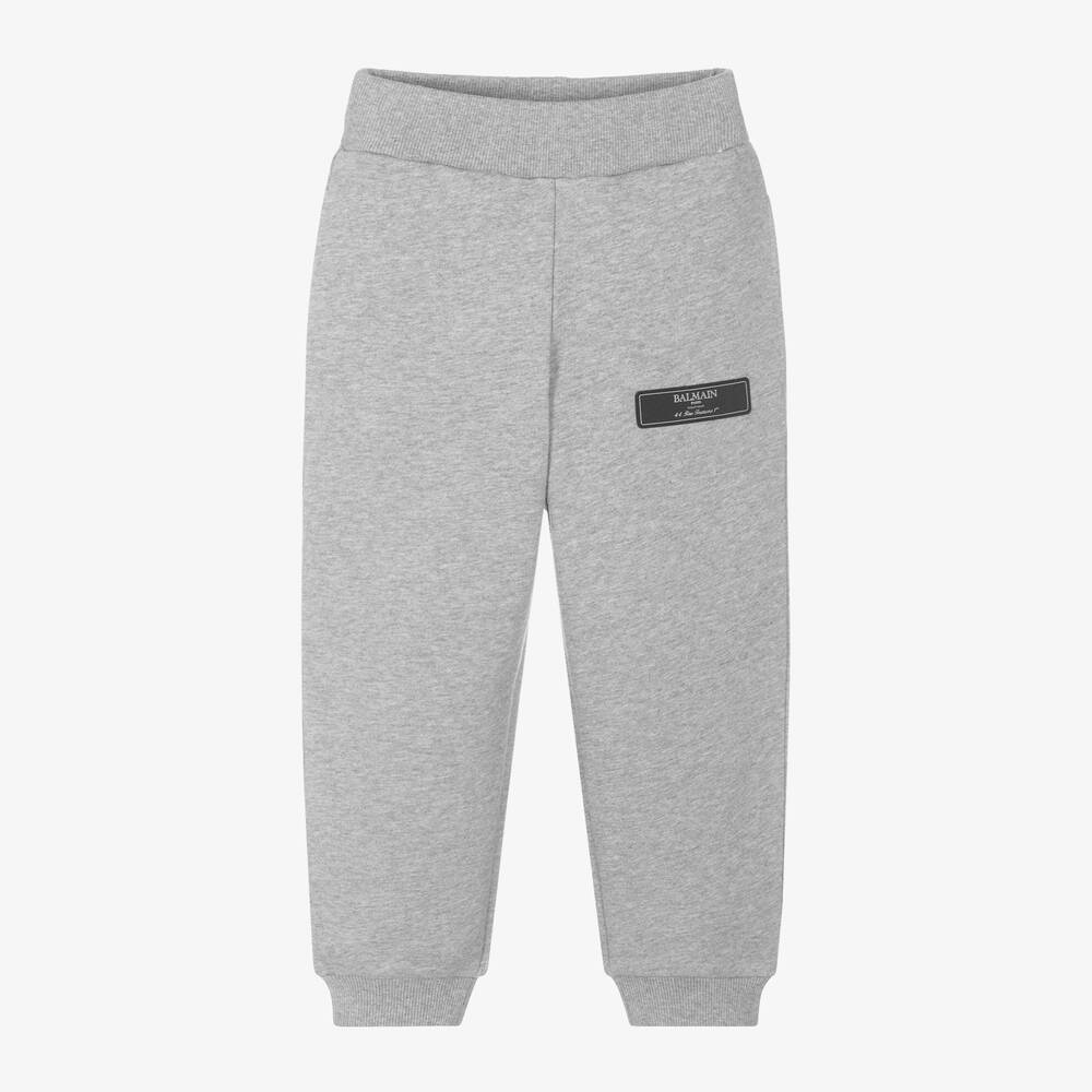 Grey marl cotton joggers for boys by luxury French fashion house Balmain. Made in soft, mid-weight jersey, this casual style features cuffed ankles and useful side seam pockets. The ribbed elasticated waistband ensures a comfortable fit and for a signature look, there is a black logo label stitched on the front.