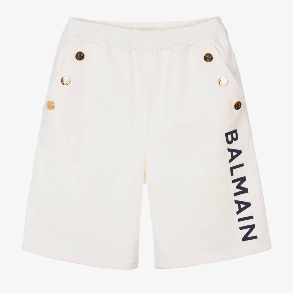 Designed by French luxury brand Balmain, these ivory shorts for boys create an instant designer statement. Printed with a navy blue logo on one leg, they feature shiny gold 'B' buttons on the sides, inspired by the brand's famous tailoring. They have a comfortable stretchy waist and longer length, making them ideal for comfort during smart-casual occasions.
