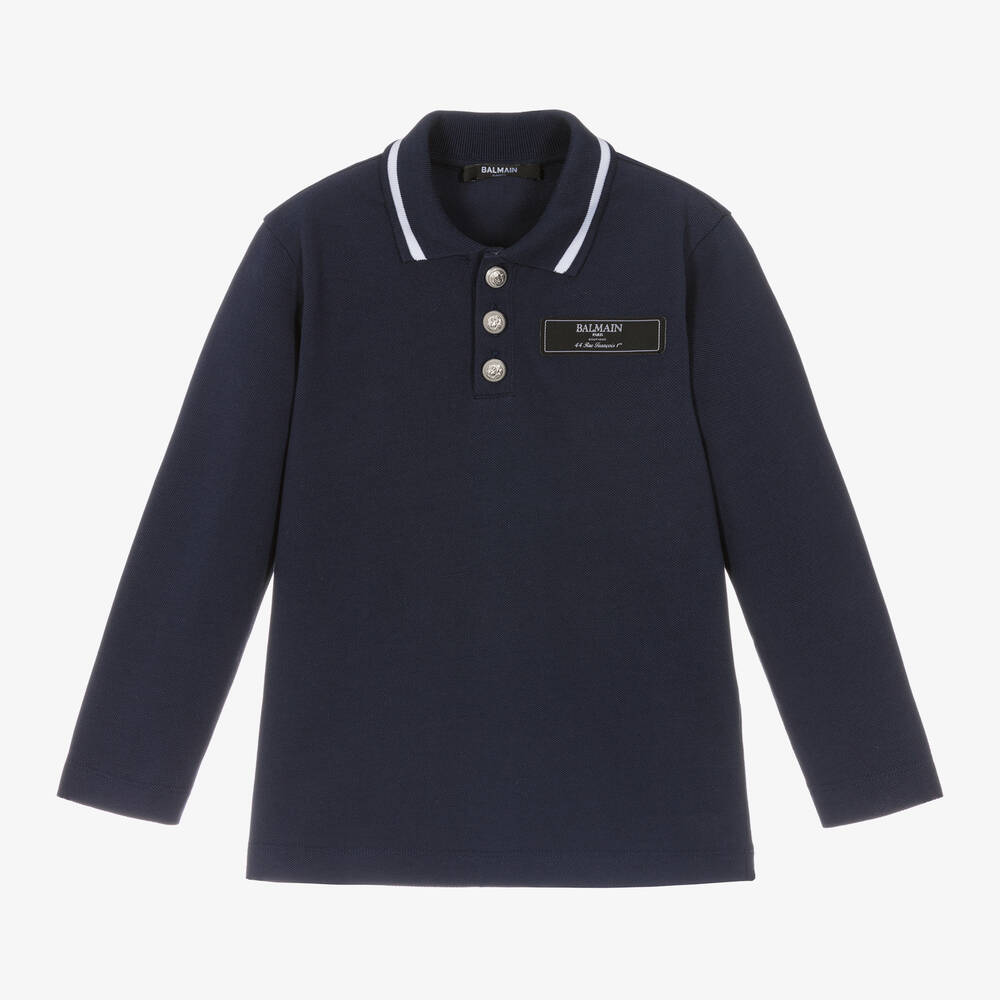 Smart navy blue long-sleeved polo shirt for boys by luxury French designer Balmain, with a black logo label sewn on one side. Made in soft, stretchy piqué it is both comfortable and stylish, with silver lion's head embossed buttons on the placket and white tipping on the ribbed collar.