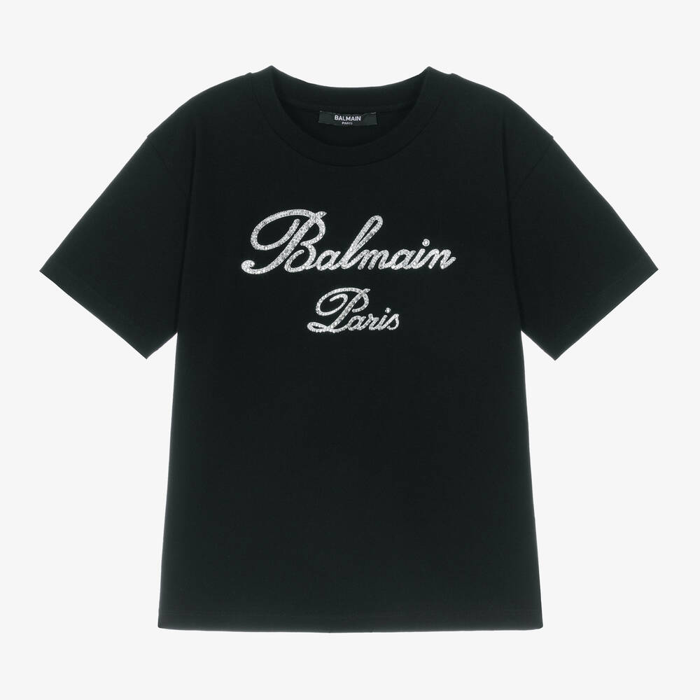 Black short-sleeved cotton T-shirt for girls, unmistakably by luxury French designer Balmain. Just right for elevating casual outfits, it is embellished with a sparkling silver diamanté logo across the chest and is made in soft, stretchy jersey with a relaxed fit.