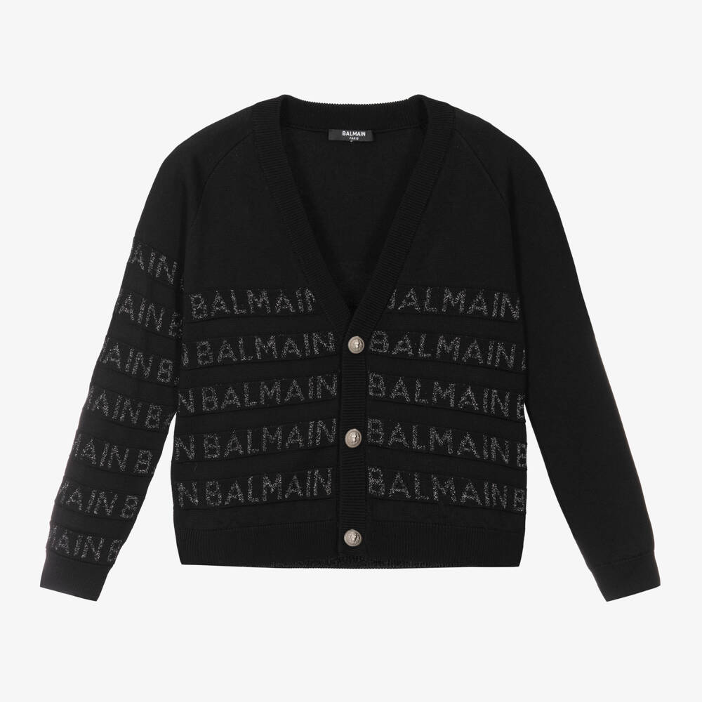 Stylish black cardigan for girls by Balmain, the luxury French designer. Knitted in a soft cotton and viscose blend, this chic layering piece has silver jacquard logo stripes on the bodice and the long sleeves. It fastens with shiny silver buttons on the front, shaped in the ornate Balmain medallion logo which is synonymous with the brand.