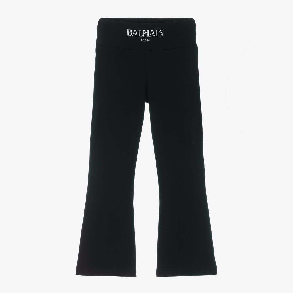 Black flared leggings for girls by luxury French designer, Balmain. Made in soft, easy-to-wear cotton jersey, these cool trousers have a stylish, flared shape and monochrome logo print on the elasticated waist.