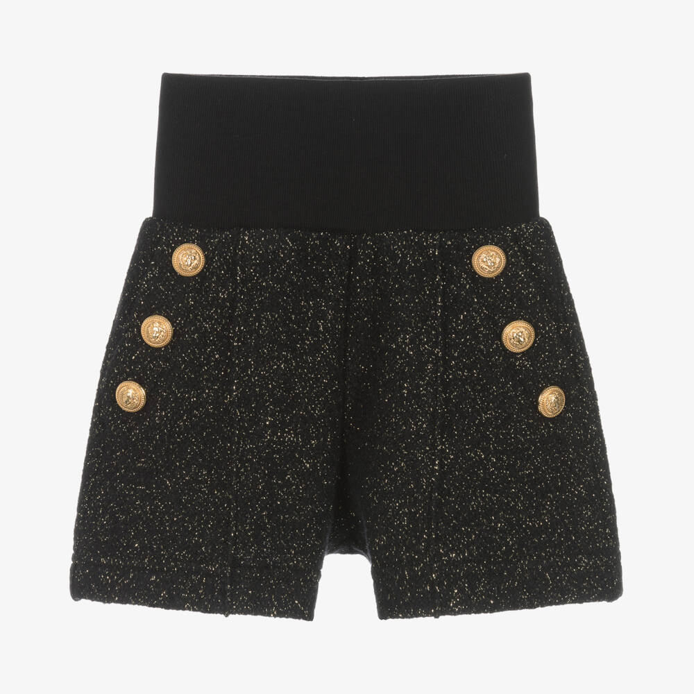 Smart black shorts for girls by luxury French designer Balmain, made in a soft mid-weight wool blend. Flecked with a gold thread for a glamorous touch, these stylish shorts have decorative branded gold buttons on the front pockets. Easy to wear, they simply pull on and have a wide elasticated waistband for a comfortable fit.