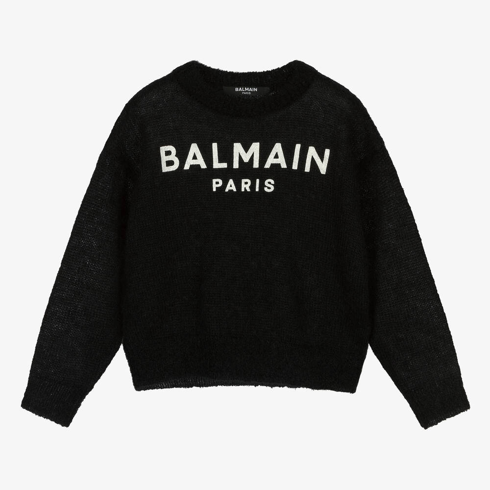 Beautifully soft and lightweight for girls, a black jumper from luxury French designer, Balmain. Slightly cropped, with an on-trend relaxed fit, it has a bold white logo print across the front. Knitted in a mohair and wool blend, a handmade treatment gives each jumper a unique and exclusive finish.