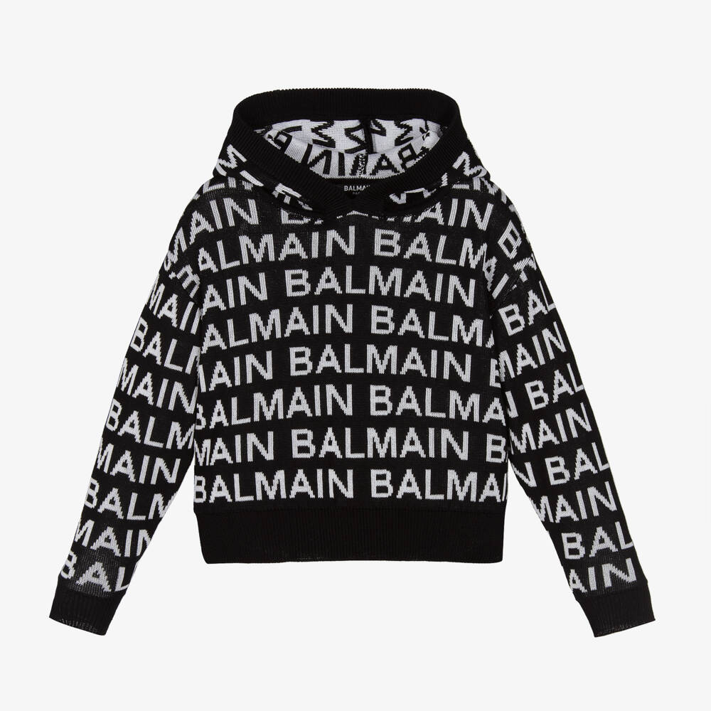 Cool black cropped hoodie for girls, by luxury French designer Balmain. Knitted in a beautifully soft cotton blend, it has a repeat intarsia logo design all over for an unmistakable designer look. It also has stretchy ribbed trims on the sleeves, the hood and the hem for luxurious comfort with laidback styling.