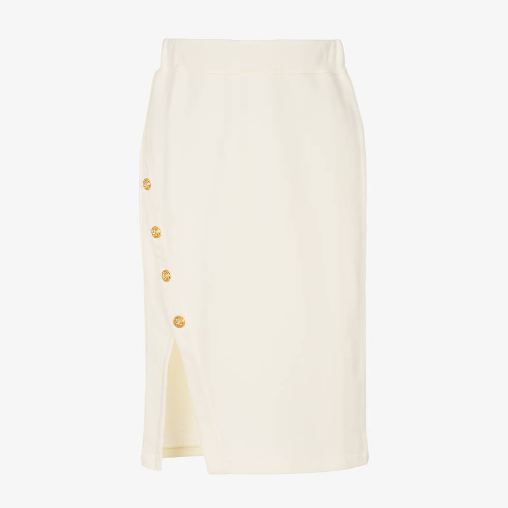Mini-me ivory skirt for older girls by luxury French label Balmain, made from mid-weight cotton jersey with a slight stretch for comfort. In a chic, fitted style it is detailed with shiny gold medallion buttons down one side, with a split seam for ease of movement and a stylish finish. The ribbed waistband is gently elasticated for comfort.