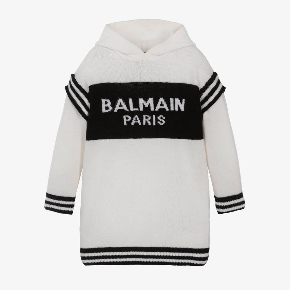 Ivory Mini-me dress for girls by luxury label, Balmain. Knitted in an exquisite wool and cashmere blend, this contemporary style has cool varsity stripes on the sleeves and the hem. The brand's Balmain Paris can be seen in an intarsia panel across the chest, adding undeniable designer branding to the relaxed look.