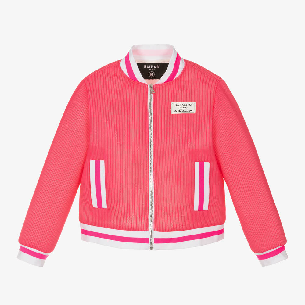 A true statement piece from luxury brand Balmain, this bright pink bomber jacket for girls is made in ribbed, structured neoprene for a chic designer look. The logo label on the front bears the fashion house's historic Parisian address and the silver-tone zip is engraved with branding, adding those extra designer touches. This long-sleeved, Italian-crafted jacket has striped trims in neon pink, convenient side pockets, and a silky-smooth lining.