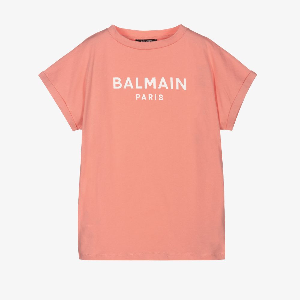 Girls pink T-shirt by luxury French brand Balmain. It is made in soft cotton jersey with a white Balmain Paris logo print on the front, and turn ups on the sleeves.