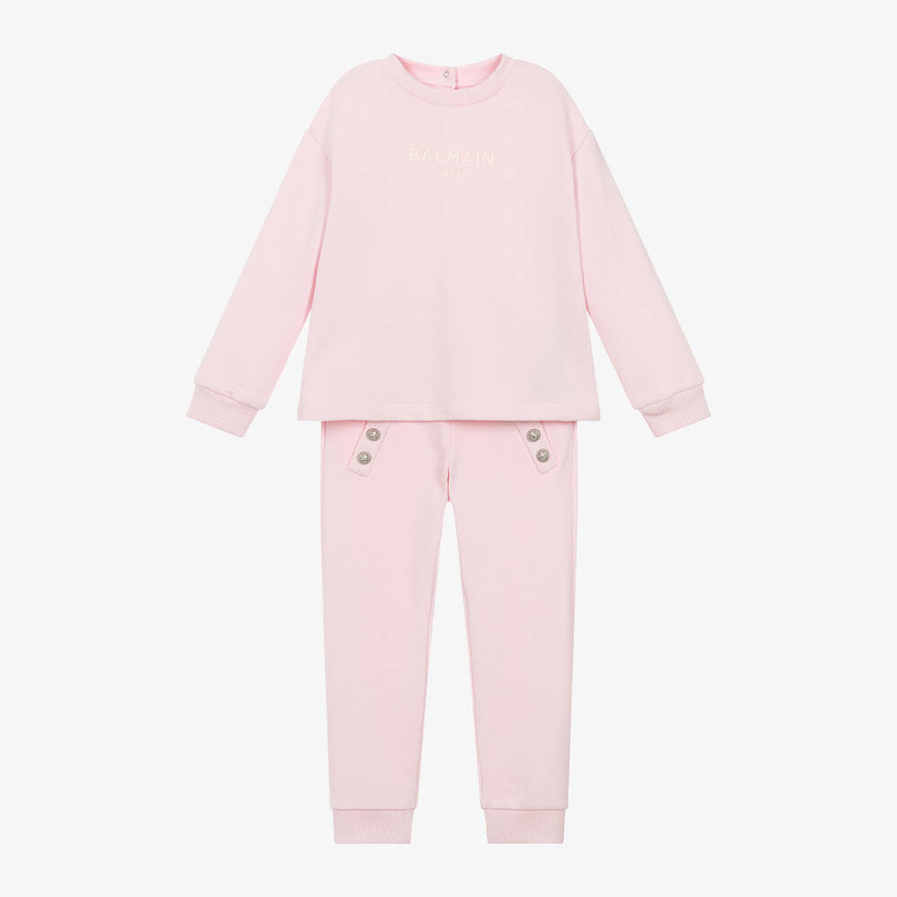 Light pink tracksuit for younger girls from luxury fashion house Balmain. This pastel-coloured tracksuit is made in soft, mid-weight cotton jersey for gentle-on-the-skin comfort. The sweatshirt has an embroidered Balmain Paris logo on the front and branded poppers on the back, both in complementary ivory. Adding designer appeal to the cuffed joggers are silver-hued Balmain Medallion faux buttons, a signature look from the French label.