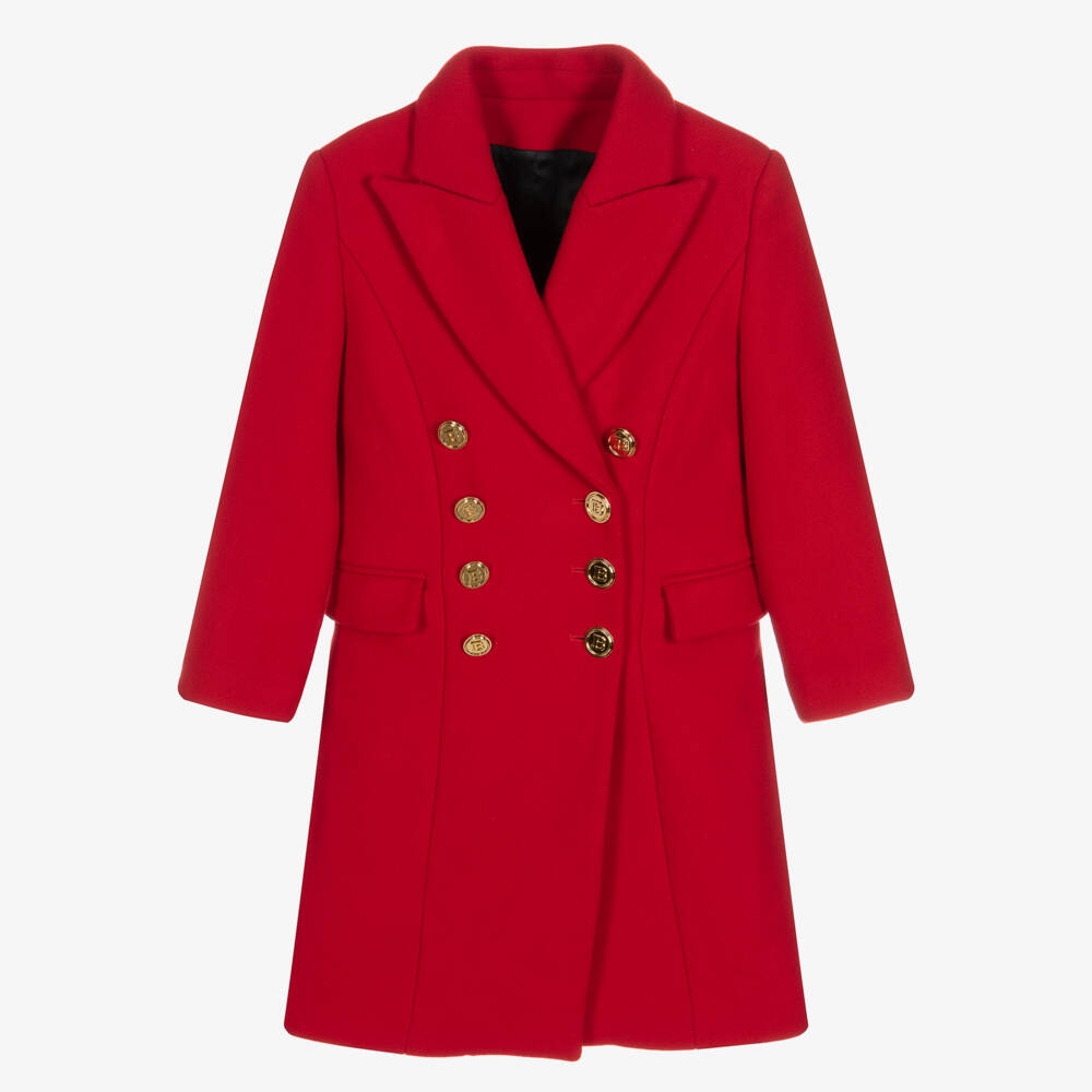 As seen in the adult collection, a chic red coat for girls by luxury designer Balmain. Made in beautifully soft wool, this stunning coat has a smart collar, panels on the front for a feminine look, and shiny gold Balmain buttons in traditional double breasted styling.