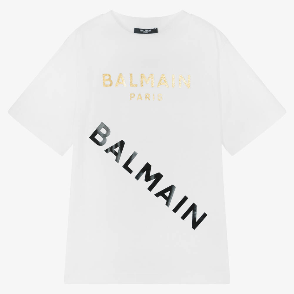 Casual white cotton T-shirt dress for girls, by luxury designer Balmain. Made in soft cotton jersey for all-day comfort, this easy-to-wear piece is printed with shiny gold Balmain Paris logo on the front, and a fun diagonal black logo underneath. This garment is made from cultivated-grown cotton in an ecological way.