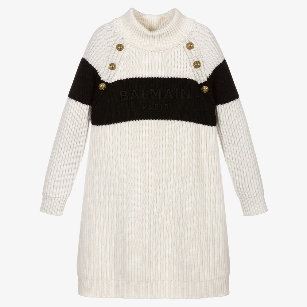 Ivory knitted turtleneck dress for girls by luxury French brand, Balmain. Made with a very soft wool and cashmere blend, this elegant sweater dress has a black panel across the bodice, with logo embroidery and gold crested buttons.
