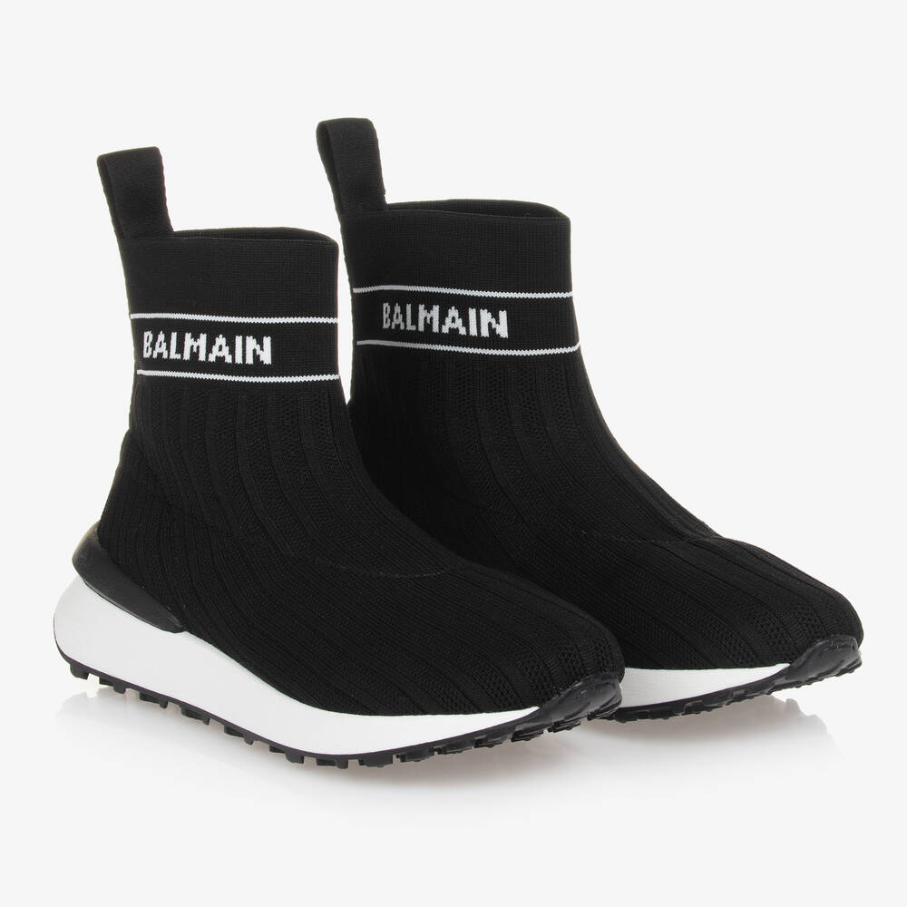 Cool for teen boys and girls, these black high-top trainers are by luxury French label, Balmain. Sleek and sporty, these sock-style sneakers are made in a soft and stretchy knit fabric with textured ribs and a white intarsia logo branding around the ankle cuffs. The insole is padded for comfort and there is a pull tab on the back to assist with slip-on. Adding a contemporary vibe, the textured outsole is made in non-slip rubber in black and white.