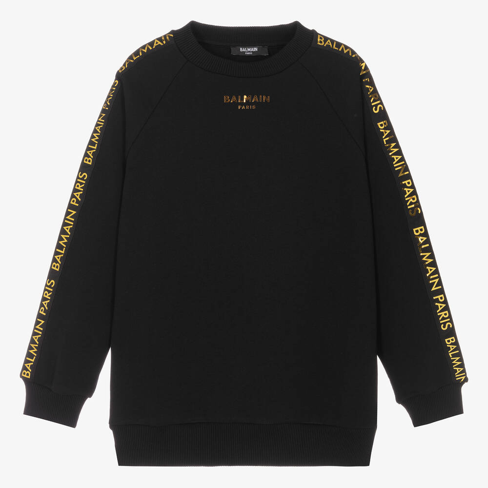 Teen boys black sweatshirt by French luxury designer, Balmain. Transforming this casual style is the metallic gold Balmain Paris logo prints on the chest and the long sleeves. Laidback days spent lounging are instantly elevated with this piece, which is made in soft cotton jersey for an extra comfortable fit.