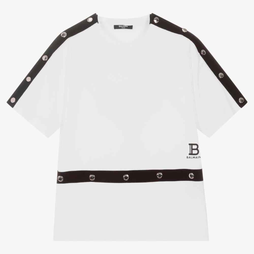 Teen boys white cotton T-shirt by luxury French designer Balmain, with a black logo print on the front. There are silver branded studs on the black trim across the front and matching popper fastenings on the shoulders. Made in soft and comfortable jersey, this piece combines easy wearing fabric with contemporary touches.