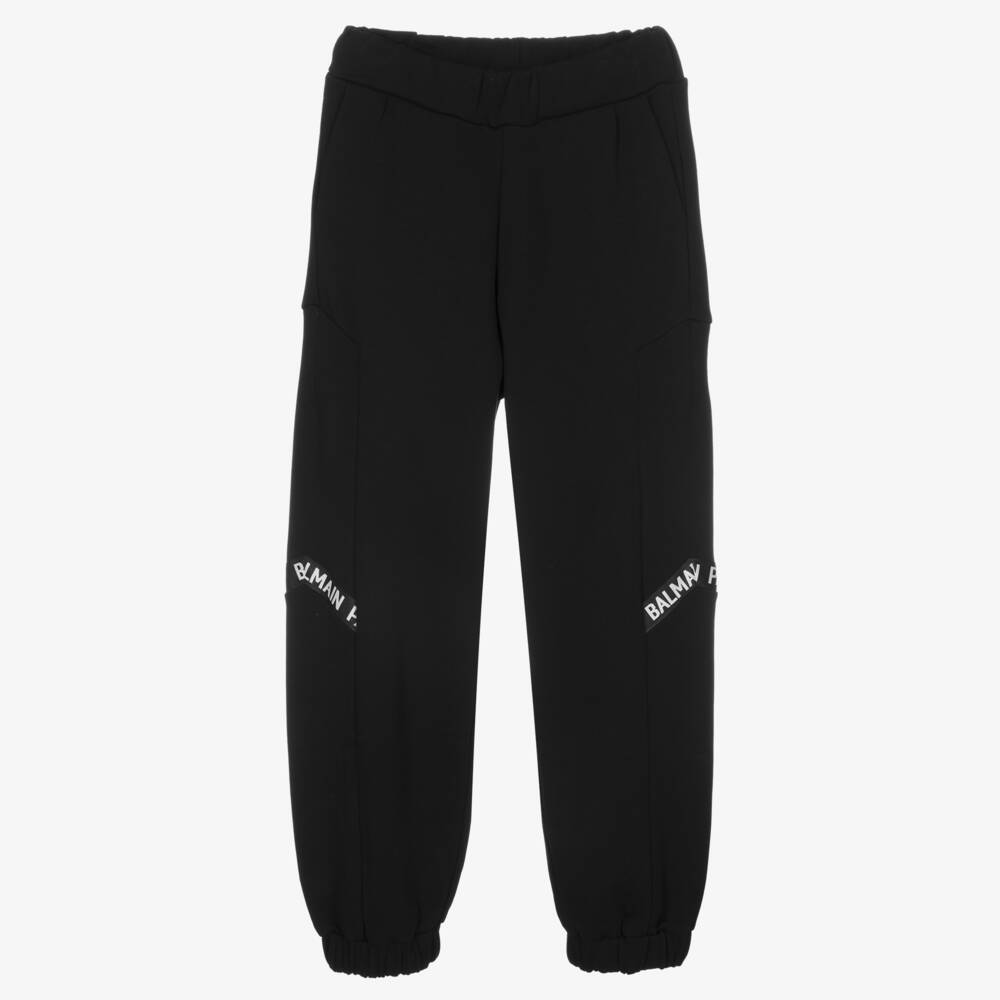 Cool, relaxed-fit black joggers for teen girls, by French luxury brand Balmain. Featuring Balmain Paris logo tape detail on the legs, they have slanted front pockets, and are made in soft, cotton jersey for a comfortable fit.