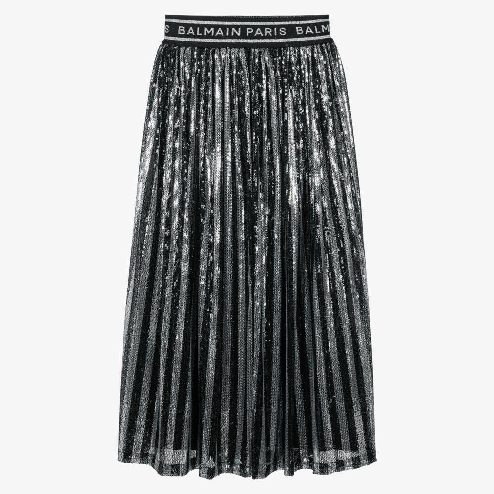 Pretty skirt for teen girls by luxury French brand Balmain, as seen in the main collection. It has an elasticated waistband with a glittery silver jacquard logos for a sparkly designer statement. This stylish maxi skirt, ideal for a special occasion, is made in soft mesh, decorated with shiny black and silver sequins in a lovely striped pattern and has a logo-patterned silky lining for comfort.