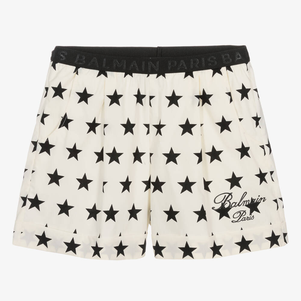 Designed for teen girls, these ivory pleat-front shorts by luxury label Balmain are printed with black star motifs. Logo lettering can be seen on one leg and around the elasticated tape waistband for further designer branding. These lightweight cotton shorts have turned-up cuffs for a smart-casual touch and useful front pockets for storing everyday essentials.