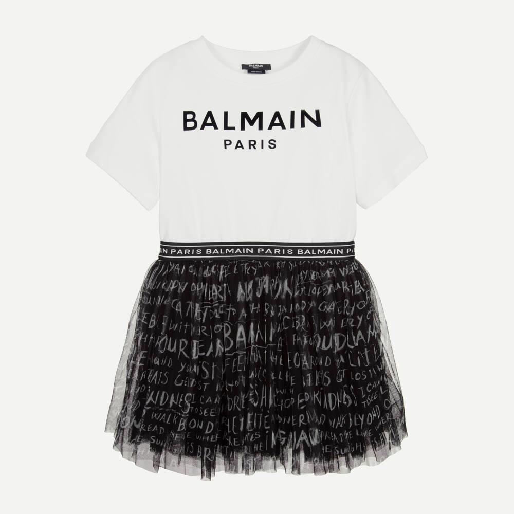 Black and white dress for teen girls by luxury French fashion house Balmain, with a black and silver Balmain Paris logo print across the chest. The two-in-one silhouette has a white bodice, made from sweatshirt organic cotton jersey with a ribbed neckline. Made with layers of tulle, the lined black skirt is finished with cool white lettering for added dimension. The dress is complete with an elasticated logo stripe band on the waist.