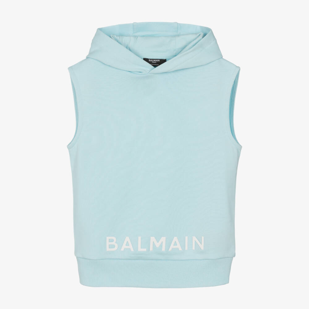 Sky blue cotton hoodie for teen boys and girls from luxury brand, Balmain. Effortlessly cool, this sleeveless design is crafted in medium-weight jersey, with the French designer's distinctive white raised logo lettering above the ribbed hem.