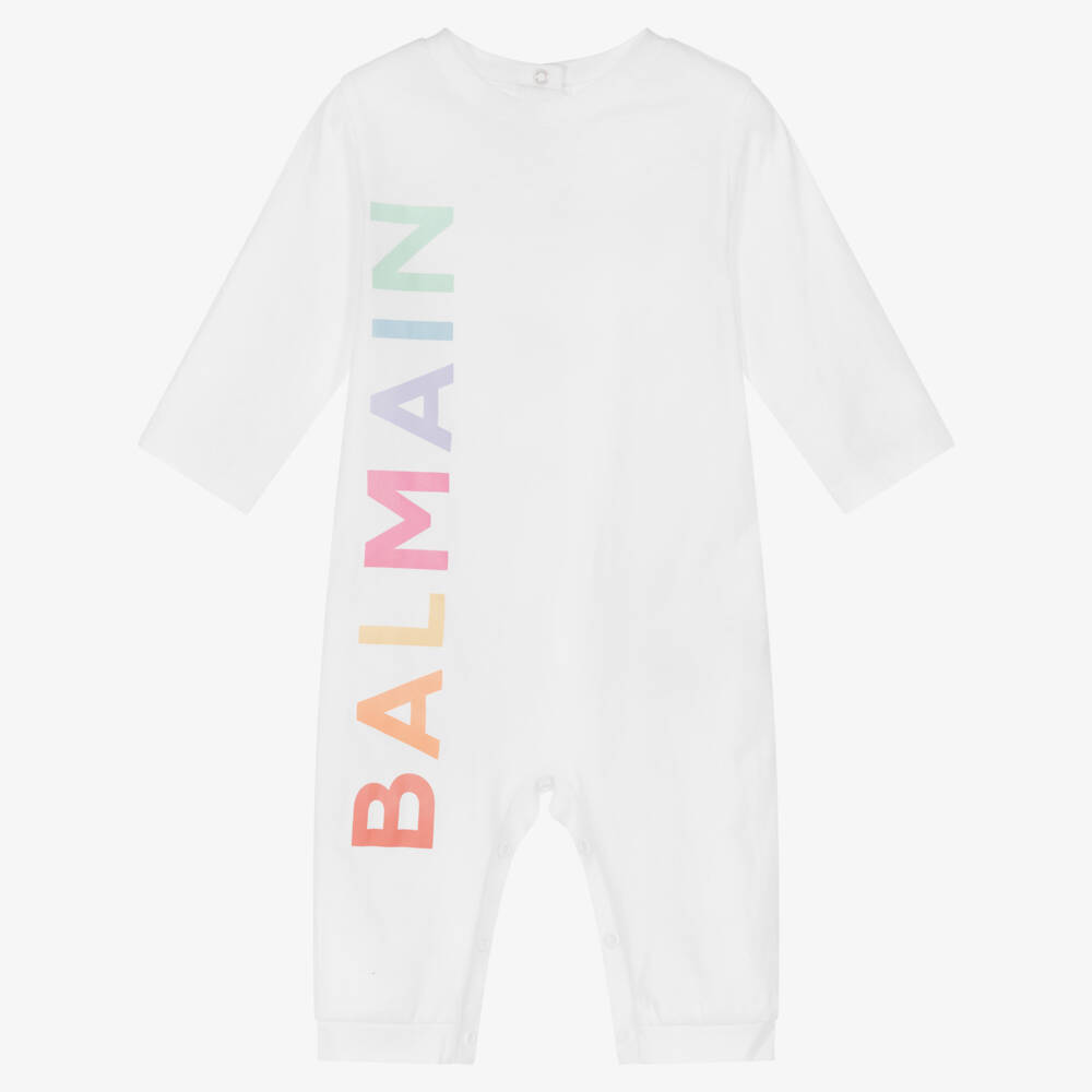 Lovely white organic cotton romper for baby boys and girls by luxury French brand Balmain. Made in soft and stretchy jersey, this fun one-piece has colourful logo lettering down one side of the front, for a playful designer style. There are convenient poppers on the back and between the legs, to help make dressing fuss-free.