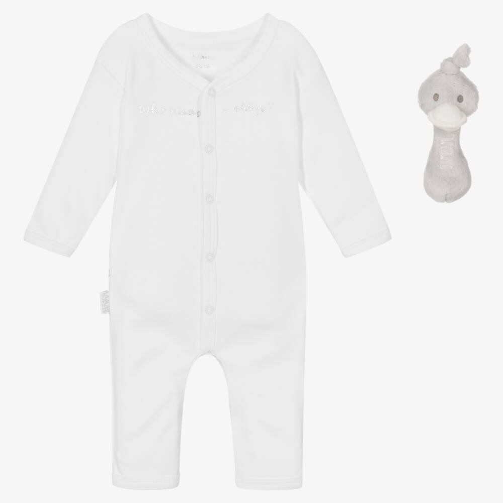 Ivory romper and plush toy gift set for baby boys and girls by Bam Bam. The babysuit is made in soft and comfortable cotton jersey, with 'Who needs sleep?' printed on the front in silver letters. There are easy-fastening poppers down the front and between the legs. The cute little duck toy is made in soft plush and just the right size for little hands to hold. Coming in a gift box, this adorable set makes an ideal present for a new arrival.
