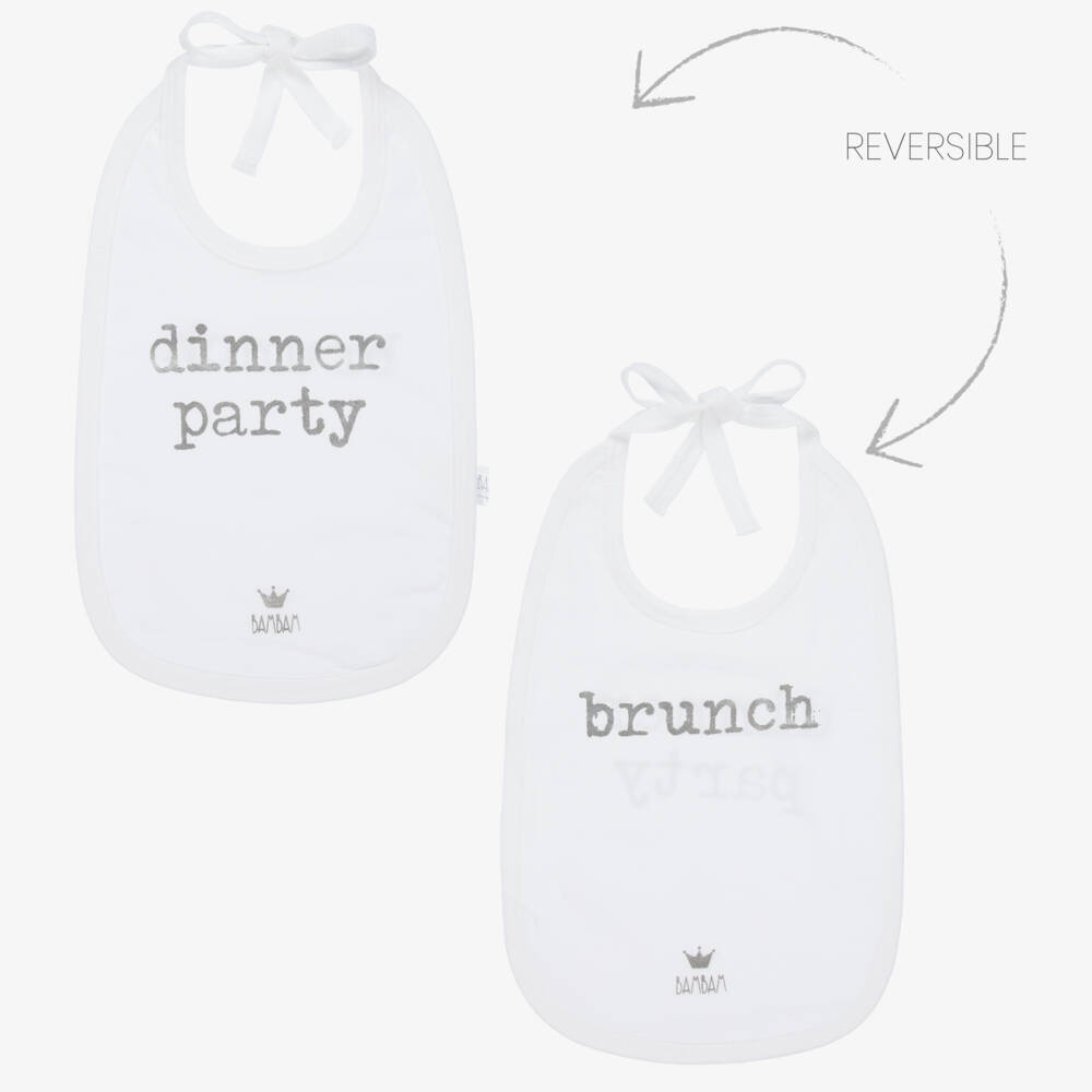 Bam Bam white bib for baby boys and girls, made from soft cotton jersey. This cute design has a silver print of 'Dinner Party' on one side, with 'Brunch' on the other. It has ties to fasten around the neck.