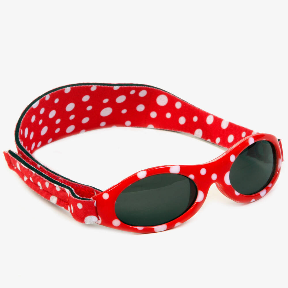 Banz sunglasses, in red with white spots, suitable for little boys and girls. They have category three lenses which offer high sun glare reduction and ultimate UV protection. On the underside is a protective nose and brow piece made from soft silicone for comfort. The adjustable, elasticated strap fits around the head and fastens with a velcro strip.