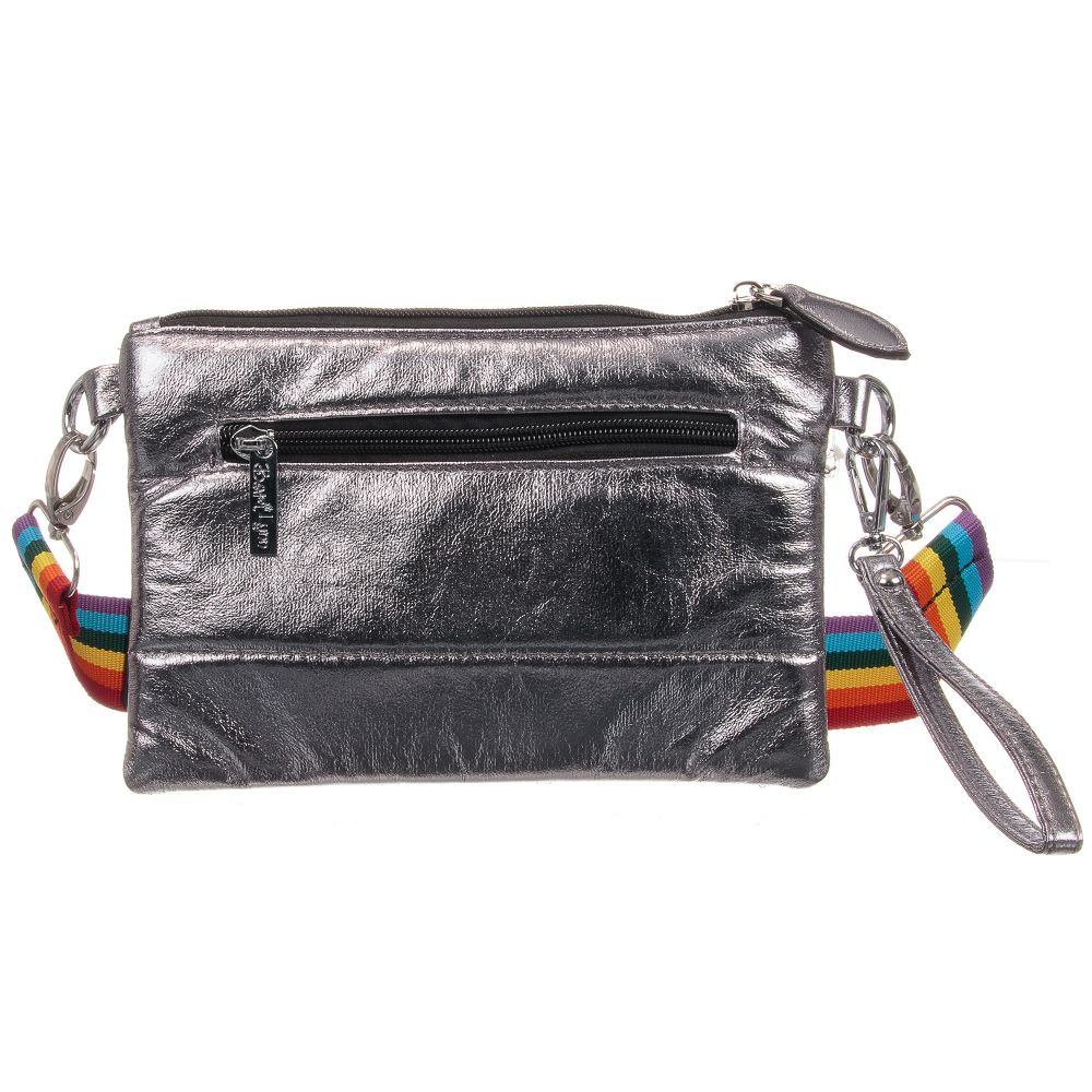 Girls metallic puff silver belt bag by Bari Lynn. There is a removable wrist strap and a rainbow belt strap, with a side zip and zip across the top. The inside is lined in fabric.