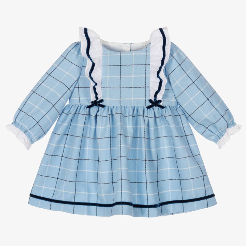 Traditional pale blue checked dress for baby girls by British heritage brand Beatrice & George, exclusive to Childrensalon. Made in a super soft viscose-blend twill, it has large white poplin frills over the shoulders with pretty blue velvet trims and bows. There are more white frills on the gently elasticated cuffs and a coordinating blue velvet trim around the hemline. It fastens on the back with logo buttons and comes with useful, matching bloomers.