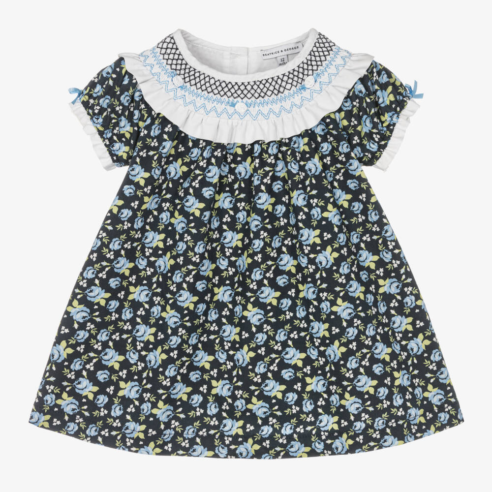Navy blue organic cotton dress for baby girls by British heritage brand Beatrice & George, exclusive to Childrensalon. The dress has a traditional, smocked and embroidered neckline, decorated with rose buds and a frilled trim. The coordinating, gently elasticated, puffed sleeves have pretty pale blue satin ribbons. Made in comfortable, lightweight poplin with a contrasting pale blue floral pattern, it fastens around the back with logo buttons. It comes with useful white poplin bloomers that have a frilled, elasticated waist.