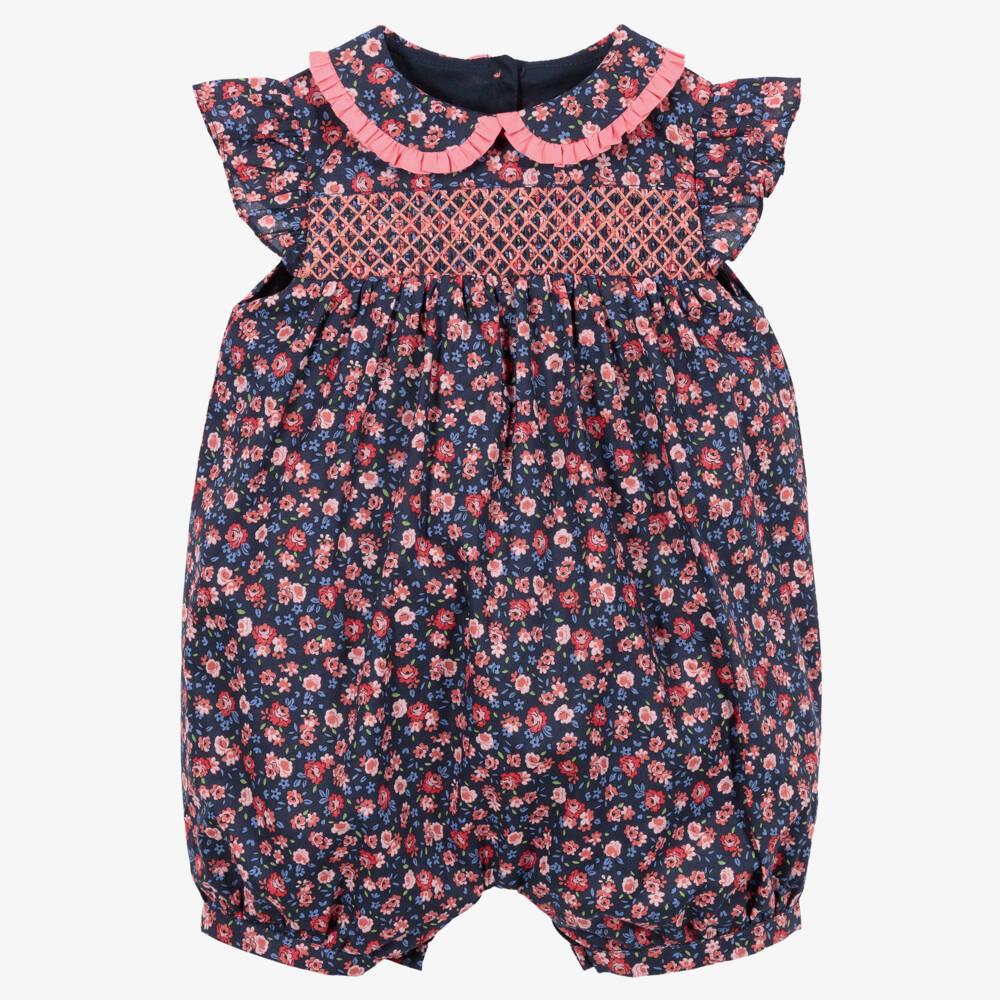 Baby girls pretty navy blue and pink floral shortie by Beatrice & George, exclusive to Childrensalon. Made in lightweight cotton poplin, it has a frilly pink trim on the collar, short, ruffled sleeves and a traditional, embroidered, smocked panel across the chest. The shortie is lined in soft cotton for comfort and fastens with buttons on the back and between the legs.