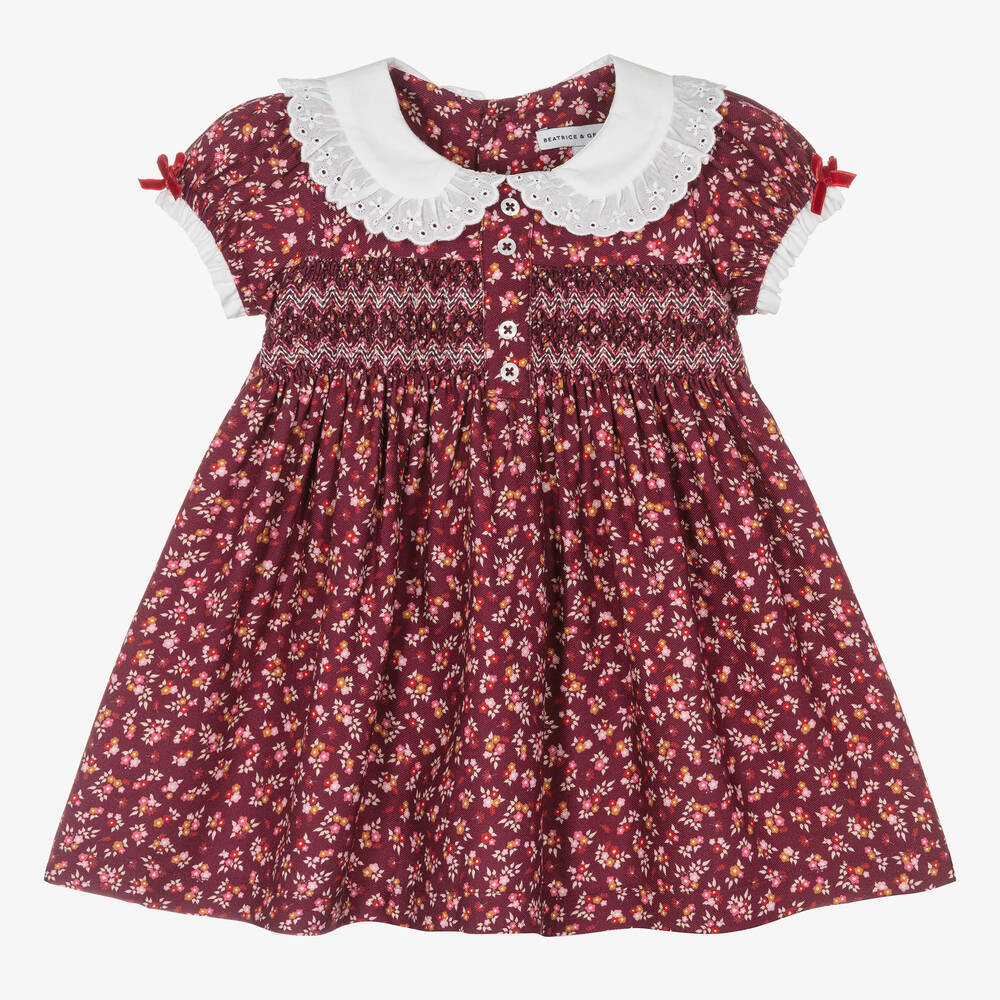 Exclusive to Childrensalon, a burgundy red dress for baby girls by British heritage brand Beatrice & George. Made in soft, viscose twill with a contrasting pink, yellow and ivory floral print, it has a traditional, smocked and embroidered band across the bodice, with decorative logo buttons. The white collar has a frilled lace trim and the coordinating, gently elasticated, puffed sleeves have red velvet satin ribbons. Fully lined in voile for comfort, there are logo button fastenings around the back. The dress comes with useful, matching bloomers.