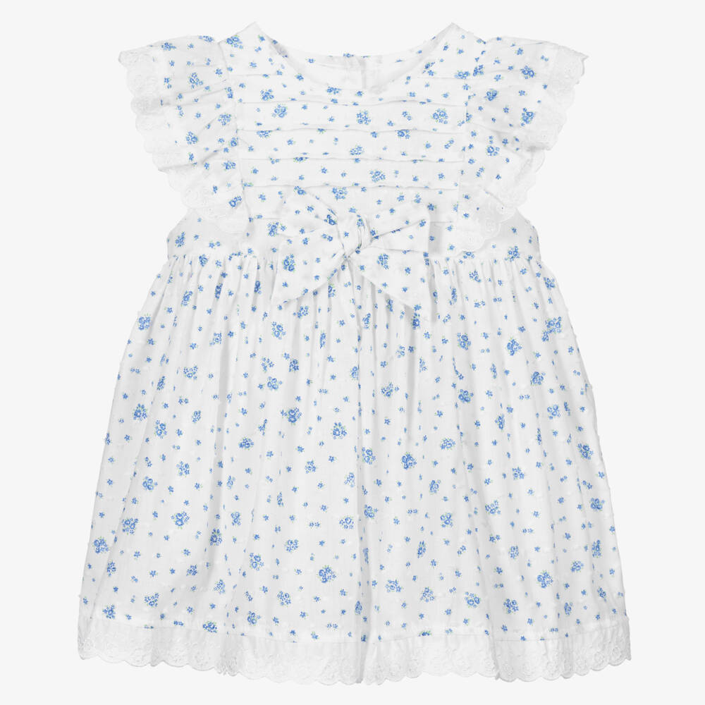 White dress with a blue floral print for little girls by British heritage brand Beatrice & George, exclusive to Childrensalon. The dress is made lightweight plumetis cotton with pin tucks across the bodice, a fixed bow on the waistline and broderie anglaise trims on the ruffled sleeves. It is lined in lightweight cotton voile, fastens with buttons on the back and comes with useful, matching white knickers.