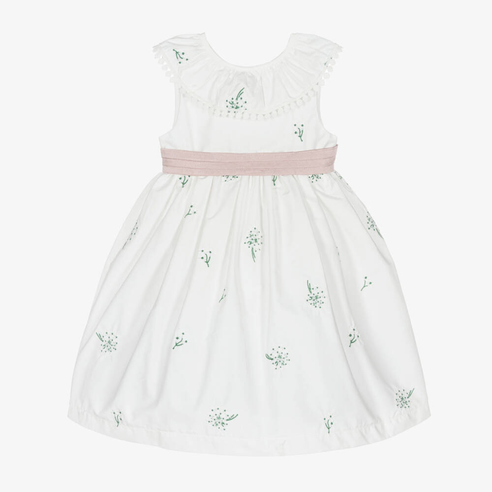 Exclusive to Childrensalon, a gorgeous white cotton dress for baby girls by British heritage brand Beatrice & George. Made in lightweight poplin, it is beautifully embroidered with white and green floral bouquets, and has an embroidered trim on the pretty ruffle collar. There is a pink, pleated, attached satin belt around the waist, with a detachable bow around the back, secured with poppers. The full, gathered skirt has tulle frills on the lining for lots of extra volume. It fastens with buttons on the back.