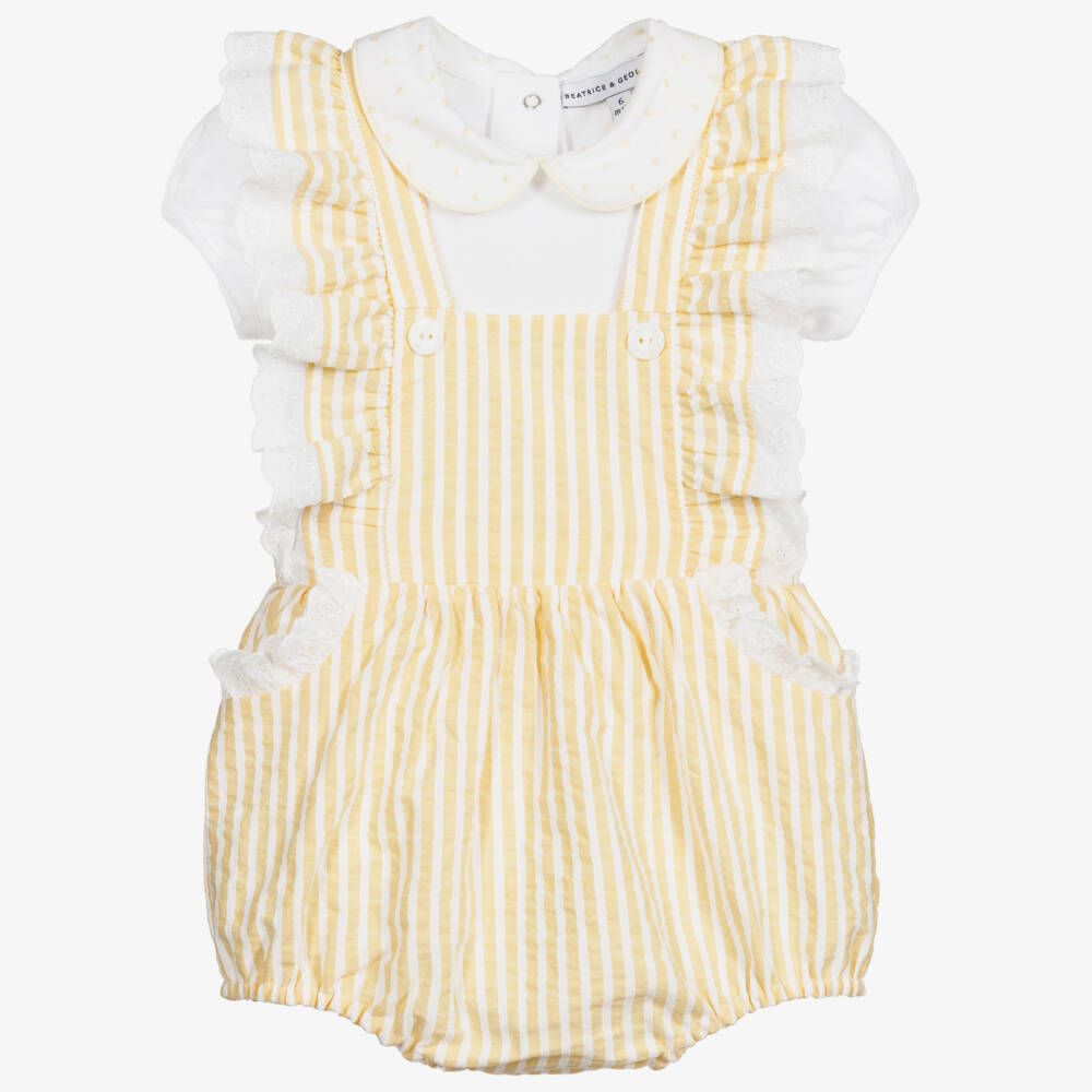 Exclusive to Childrensalon, a sweet yellow cotton dungaree shorts set for baby girls by British heritage brand Beatrice & George. The comfortable, white jersey bodysuit has embroidered yellow plumetis on the collar and pretty puffed sleeves. There are popper fastenings down the back and between the legs, so it never becomes untucked. The dungarees are made in yellow and white striped seersucker, with white broderie anglaise trims and adjustable, buttoned shoulder straps.