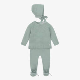 Exclusive to Childrensalon, a beige two piece babygrow set for boys and girls by traditional brand Beatrice & George. Knitted in a super soft cashmere, Merino wool and viscose blend, the sweater and bonnet have beautiful, scalloped, cut work detailing. The coordinating bottoms have a comfortable, elasticated waist and little ties around the feet that fasten in a bow.