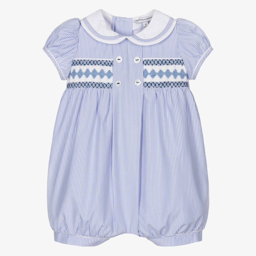 Traditional blue and white striped shortie for little boys and girls by British heritage brand Beatrice & George, exclusive to Childrensalon. Made in a lightweight cotton blend, it is beautifully hand-smocked and embroidered across the bodice. It has puffed sleeves, white piped trims and button fastenings on the back and between the legs.