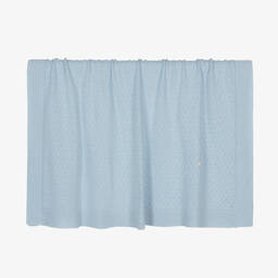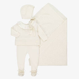 Traditionally-styled pale blue two piece babygrow set for boys and girls by British heritage brand Beatrice & George, exclusive to Childrensalon. It is knitted in a soft cashmere and wool blend, with a pretty scalloped pattern and ribbed trims. There is an ivory ruffle collar, a mother-of-pearl logo charm and button fastenings on the back. The lower part has a comfortable, gently elasticated waistband and sweet bows on the ankles. The matching bonnet has knitted ties that fasten under the chin.