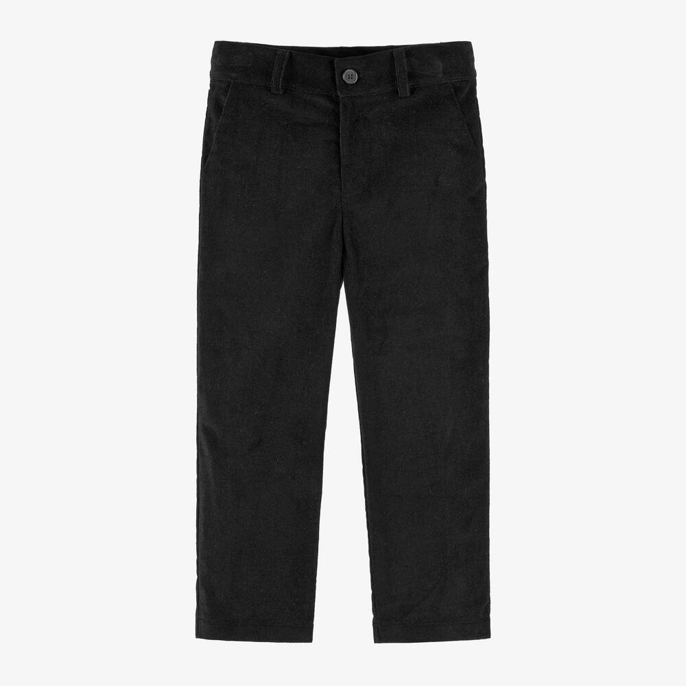 Exclusive to Childrensalon, a pair of black needlecord cotton trousers for boys by British heritage brand Beatrice & George. Ideal for both smart and casual events, they have useful, slanted front pockets and an adjustable waistband for a comfortable fit. There are loops on the waistband for that favourite belt.