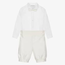 Traditional knickerbocker shorts set for boys by British brand Beatrice & George, exclusive to Childrensalon. Ideal for a special occasion, the white cotton shirt has a detachable, silky blue slub dupion bow tie, with matching piping on the placket and fastens and logo button fastenings. The coordinating blue knickerbockers have a lustrous pink sheen when they catch the light, smart pleats on the front and button-fastening cuffs. They are fully lined for comfort and have a useful adjustable waistband that fastens with buttons on the sides.