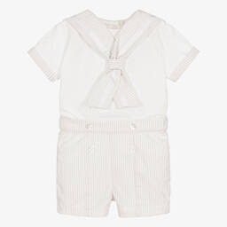 Timeless, traditional, cotton-blend shorts set for little boys by British heritage brand Beatrice & George, exclusive to Childrensalon. The white shirt has a pale blue and white striped sailor collar with white grosgrain ribbon trims, whilst the matching shorts have an adjustable waistband for a good fit. They fasten to the shirt, which has buttons on the front and back, keeping boys neat and tidy.