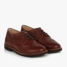 Exclusive to Childrensalon, a pair of smart brown leather brogues for boys by British heritage brand Beatrice & George. Both sturdy and supple, they have traditional decorative perforations and serrations on the front and sides, and fasten with laces. The lining and insole are made in beautifully soft leather, whilst the outer sole is non-slip for safety.