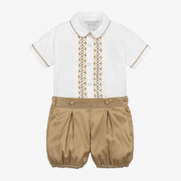 A special occasion white and gold shorts set for little boys by British heritage designer Beatrice & George, exclusive to Childrensalon. Traditionally styled, the cotton shirt has beautiful hand smocking on the front, with gold and brown hand embroidery and smart gold piping. The shorts are made in lustrous dupion with a textured slub weave, a comfortable cotton lining and an adjustable waist for the ideal fit. They have smart inverted pleats, decorative, covered buttons and gently elasticated cuffs for a classic look. Both pieces fasten together for a neat, tucked-in finish.